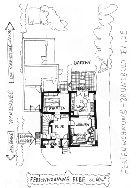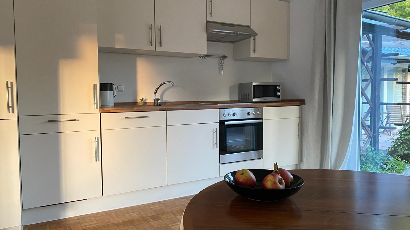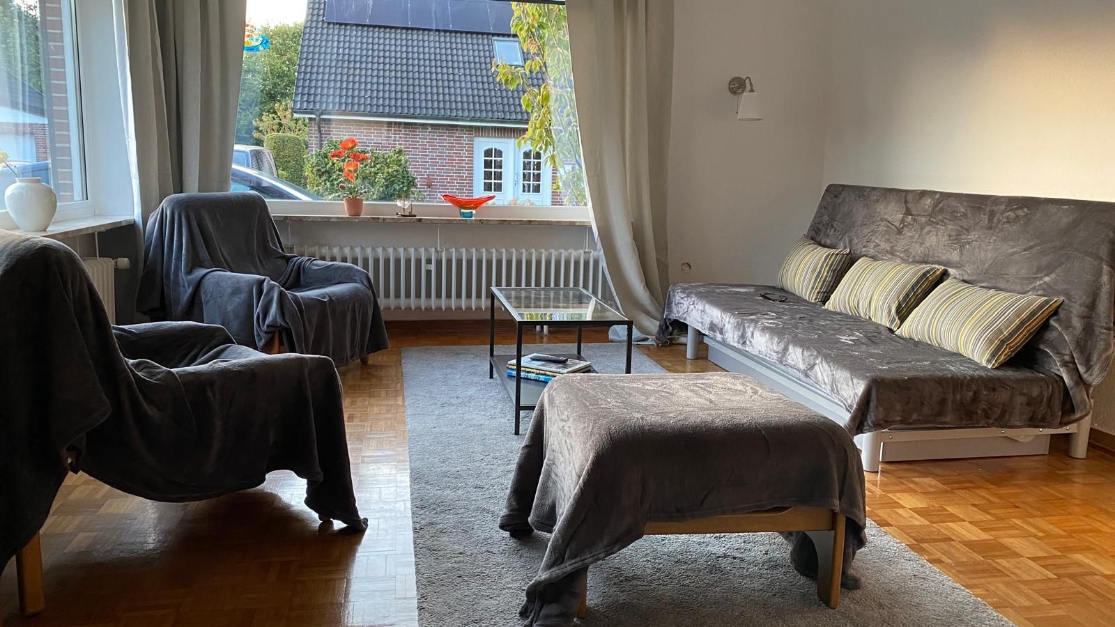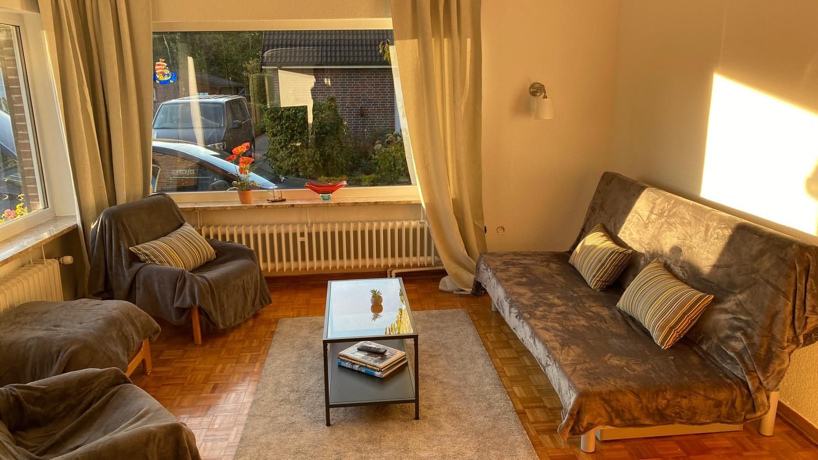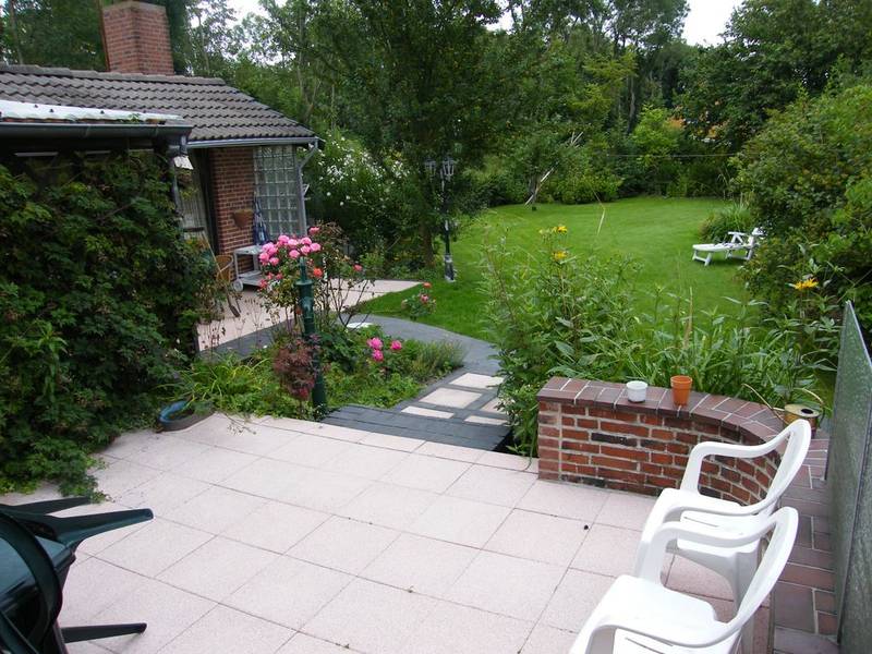 Die Wohnung Elbe befindet sich in unserem Ferienhaus im Meisenweg 8. Sie liegt in ruhiger Lage am Ende einer Sackgasse am grünen Wanderweg entlang der Brake. Hinter dem Wanderweg erstreckt sich der Friedhof wie ein grüner Park. Die Wohnung ist geeignet für 2 bis 4 Personen, es besteht ein Schlafzimmer sowie 2 großzügig ineinander übergehende Wohnzimmer mit Doppelcouch und einer komplett eingerichteten Einbauküche inclusive Geschirrspüler und Waschmaschine und ein modernes Bad mit Dusche. Das Wohnzimmer liegt in Ost/West Lage und ist damit den ganzen Tag lichtdurchflutet. 2 große Glastüren verbinden das Wohnzimmer mit der großzügigen Terrasse, auf der man es sich auf den vorhandenen Terrassenmöbeln gemütlich machen kann. Unter der Sonnenmarkise kann man geschützt den großen liebevoll angelegten Garten genießen. Ein neuer großer Fernseher mit Flachbildschirm kann sowohl von der Essecke als auch von der Couchecke genutzt werden. Ein dazugehöriger Parkplatz befindet sich direkt am Haus. Bitte haben Sie Verständnis dafür, dass im Interesse der anderen Gäste in der Wohnung - wie in allen unseren Wohnungen - nicht geraucht werden darf und Haustiere ebenfalls nicht erlaubt sind. Ab sofort steht eine 11 kW eWall Lademöglichkeit für Elektro-Fahrzeuge zur Verfügung.
