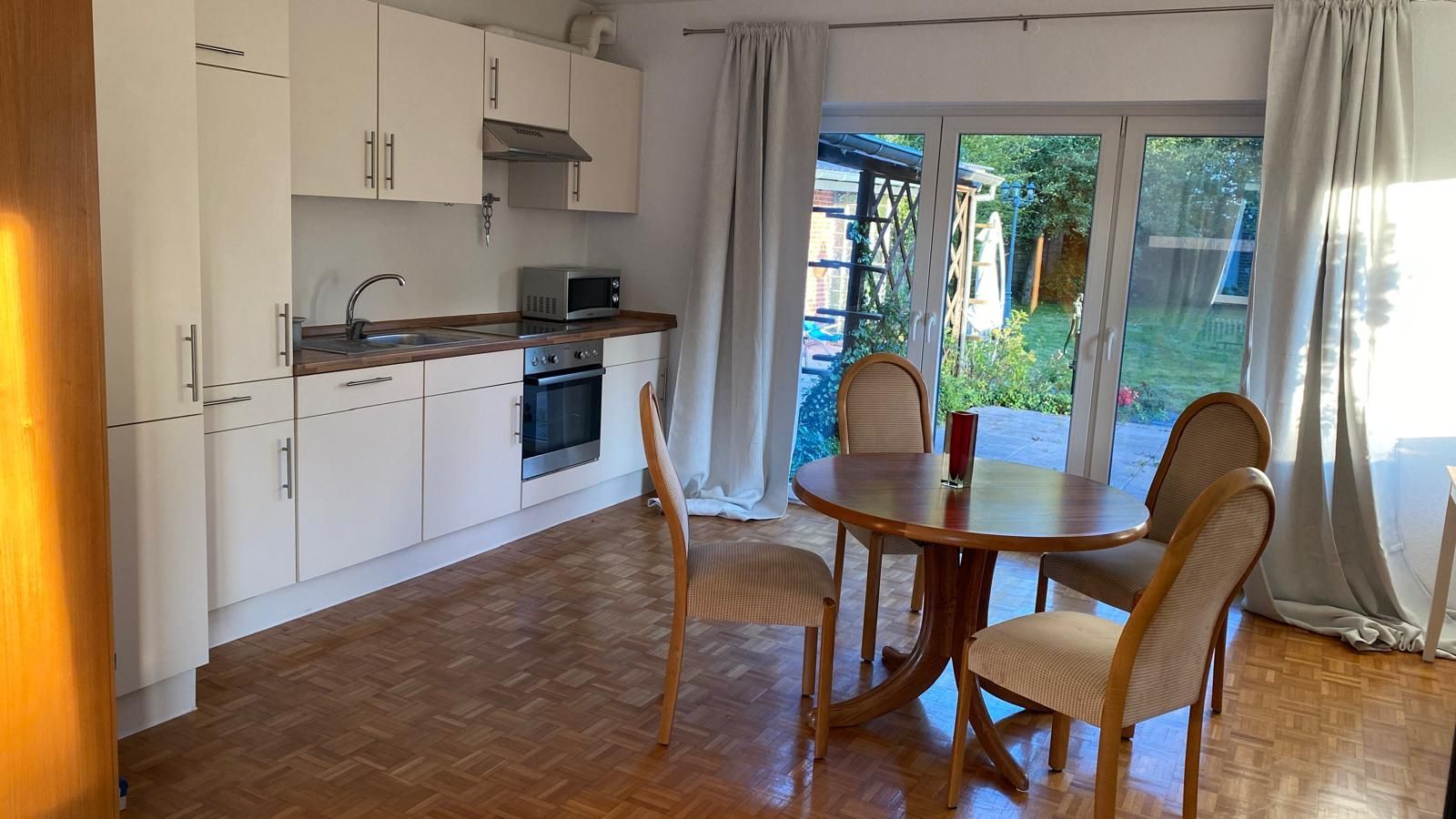 Die Wohnung Elbe befindet sich in unserem Ferienhaus im Meisenweg 8. Sie liegt in ruhiger Lage am Ende einer Sackgasse am grünen Wanderweg entlang der Brake. Hinter dem Wanderweg erstreckt sich der Friedhof wie ein grüner Park. Die Wohnung ist geeignet für 2 bis 4 Personen, es besteht ein Schlafzimmer sowie 2 großzügig ineinander übergehende Wohnzimmer mit Doppelcouch und einer komplett eingerichteten Einbauküche inclusive Geschirrspüler und Waschmaschine und ein modernes Bad mit Dusche. Das Wohnzimmer liegt in Ost/West Lage und ist damit den ganzen Tag lichtdurchflutet. 2 große Glastüren verbinden das Wohnzimmer mit der großzügigen Terrasse, auf der man es sich auf den vorhandenen Terrassenmöbeln gemütlich machen kann. Unter der Sonnenmarkise kann man geschützt den großen liebevoll angelegten Garten genießen. Ein neuer großer Fernseher mit Flachbildschirm kann sowohl von der Essecke als auch von der Couchecke genutzt werden. Ein dazugehöriger Parkplatz befindet sich direkt am Haus. Bitte haben Sie Verständnis dafür, dass im Interesse der anderen Gäste in der Wohnung - wie in allen unseren Wohnungen - nicht geraucht werden darf und Haustiere ebenfalls nicht erlaubt sind. Ab sofort steht eine 11 kW eWall Lademöglichkeit für Elektro-Fahrzeuge zur Verfügung.